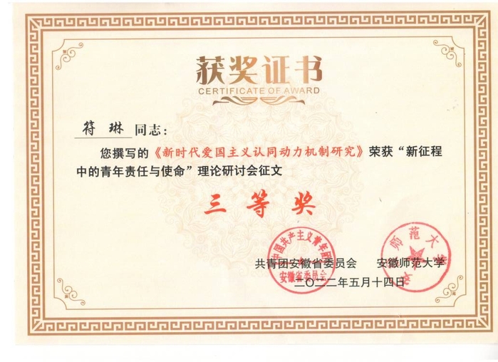 為深入學(xué)習(xí)貫徹習(xí)近平新時代中國特色社會主義思想,全面落實(shí)“喜迎二十大、永遠(yuǎn)跟黨走、奮進(jìn)新征程”主題教育實(shí)踐活動,總結(jié)和探討黨的青年工作的歷史經(jīng)驗(yàn)、現(xiàn)實(shí)價值和時代使命,共青團(tuán)安徽省委聯(lián)合安徽師范大學(xué)于今年4月,以“新征程中的青年責(zé)任與使命”為主題,面向全國公開征文。經(jīng)學(xué)校團(tuán)委推薦,教育學(xué)院學(xué)工辦主任符琳老師撰寫的論文《新時代愛國主義認(rèn)同動力機(jī)制研究》榮獲三等獎。