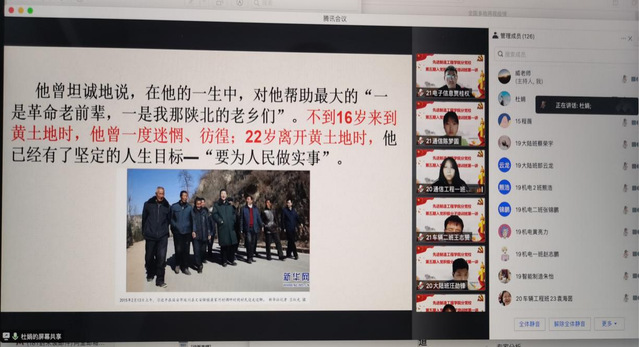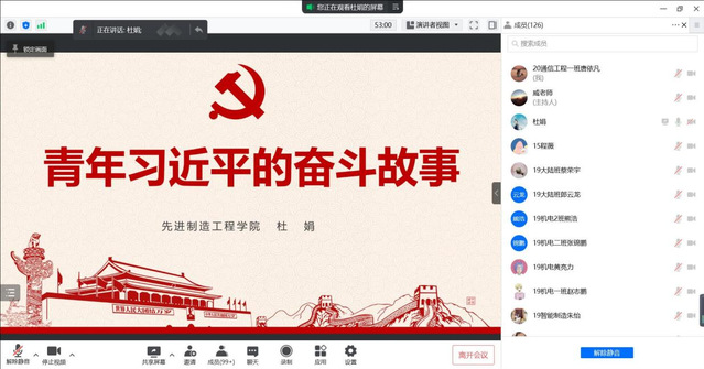 2022年4月25日中午12:30,先進制造工程學院分黨校第五期入黨積極分子通過騰訊會議平臺開展了第一次黨課教學。本次黨課由院黨委書記杜娟進行授課、機制學生黨支部書記威力旺老師主持,先進制造工程學院分黨校第五期入黨積極分子班共124名學員參加了本次課程。本次授課主題為“青年習近平的奮斗故事”。