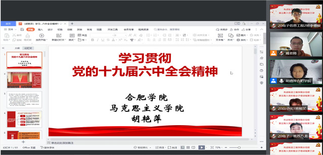 2022年5月1日晚18:00,先進(jìn)制造工程學(xué)院分黨校第五期入黨積極分子通過(guò)騰訊會(huì)議平臺(tái)開(kāi)展了第三次黨課教學(xué),本次黨課由馬克思主義學(xué)院黨委書(shū)記、院長(zhǎng)胡艷萍教授主講,機(jī)制學(xué)生黨支部書(shū)記威力旺老師主持,先進(jìn)制造工程學(xué)院分黨校第五期入黨積極分子班共124名學(xué)員參加了本次課程,本次授課主題是“學(xué)習(xí)貫徹黨的十九屆六中全會(huì)精神”。