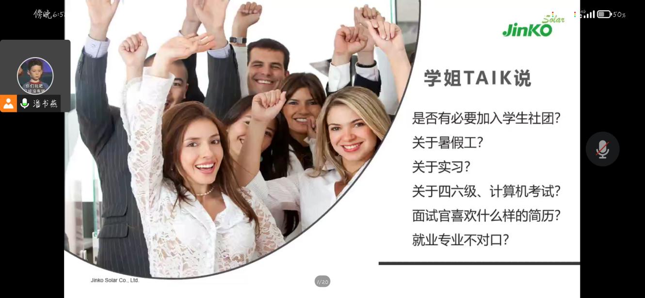 會上,潘主管通過PPT詳細地介紹了安徽晶科能源有限公司的發展歷程,實力背景,未來發展趨勢等。緊接著,潘主管從個人的親身經歷出發,淺談初入職場作為職場小白的心路歷程,進一步拉近了與同學們的距離,并針對安徽晶科能源有限公司對各專業需求進行現狀分析。對于學生在日常學習生活中如何培養職業所需的各項能力這個問題上,潘主管從社團活動、校際比賽、社會經歷及項目工作經驗等方面向同學們詳細講述了個人自我提升的方式。最后潘主管從面試技巧的各方面給大家做了簡單介紹,包括職業形象要求、基本商務禮儀知識、有效的自我介紹以及面試的回答技巧等多個方面。至此,本次活動圓滿結束。