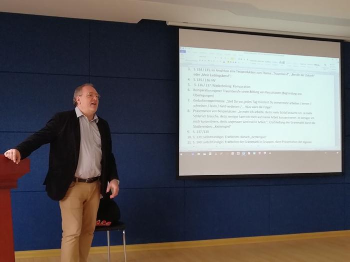 4日至7日,格里查先生就課堂組織的基本原理、課堂設(shè)計(jì)的基本模式、產(chǎn)出導(dǎo)向教學(xué)法、行動(dòng)導(dǎo)向教學(xué)法、以及如何提高學(xué)生課堂參與度等為德語(yǔ)教師舉行了為期4天的教學(xué)法講座,并引導(dǎo)老師進(jìn)行相關(guān)的課堂設(shè)計(jì)。