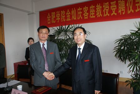 4月19日下午,合肥學院金燦慶客座教授受聘儀式暨學術報告會在院黃山路校區行政樓五樓會議室舉行,我院副院長陳嘯,外事處副處長吳克,化學與材料工程系主任邵國泉、黨總支副書記陸治河和師生代表出席了儀式和報告會。