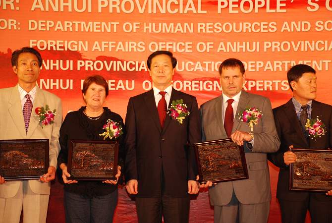9月29日下午,省委書記張寶順出席儀式并為17位獲獎專家頒獎。我院客座教授法爾克·霍恩榮獲2011年度“黃山友誼獎”,并出席了省政府在合肥稻香樓賓館舉行的2011年“黃山友誼獎”頒獎典禮暨外國專家國慶招待會。霍恩教授代表獲獎專家上臺致獲獎感言。