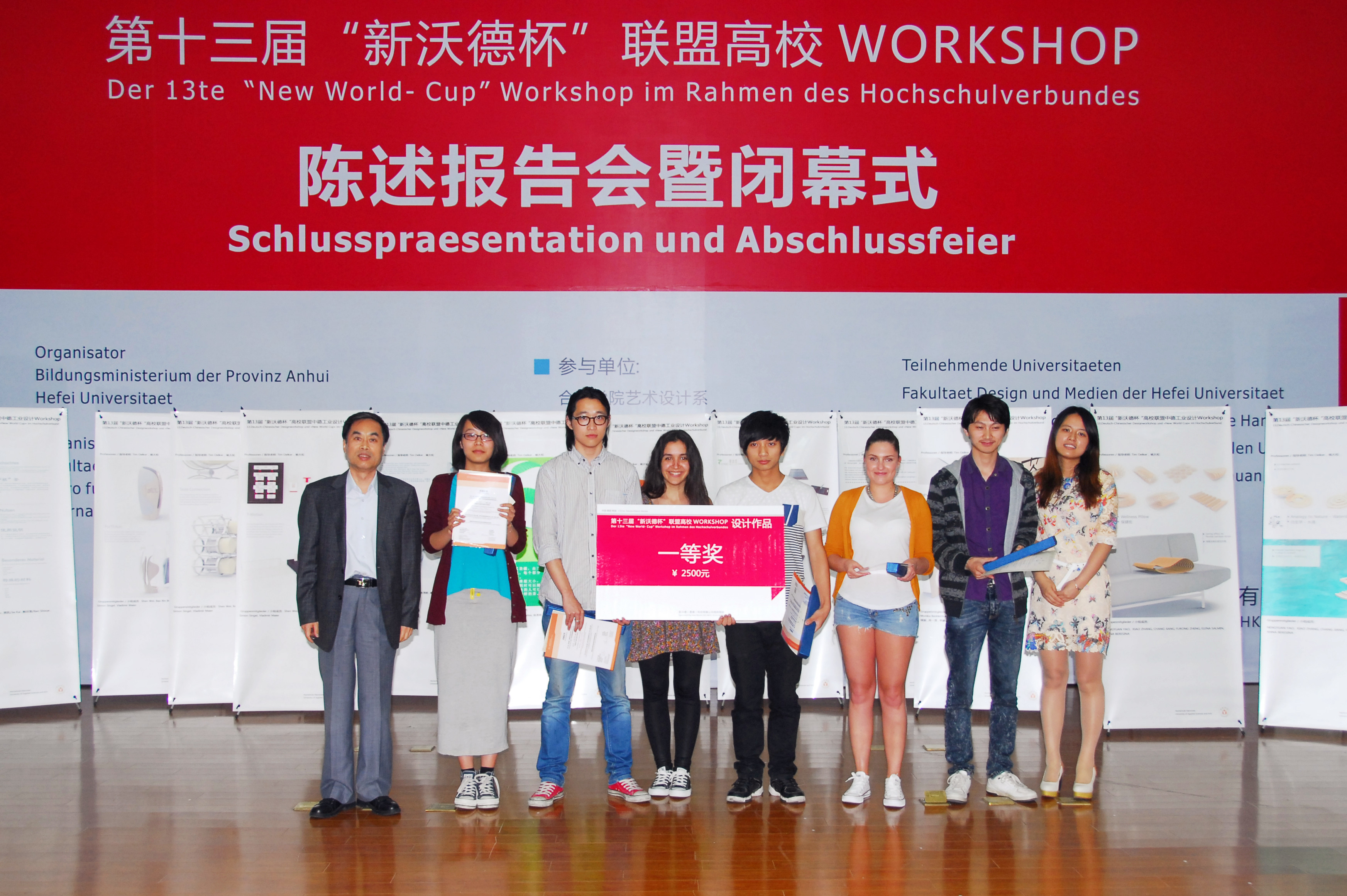 經過十天的合作交流,5月27日,第十三屆“新沃德杯”聯盟高校WORKSHOP陳述報告會暨閉幕式在我院圖書館學術報告廳圓滿落幕。安徽省教育廳外事處副處長許俊農,我院副院長陳嘯,教務處副處長杜奕智,藝術設計系謝海濤主任、楊大松教授,德國漢諾威應用科學大學奧爾克、苔莎?霍恩教授,韓國韓巴大學韓恩珠、具常教授,臺灣銘傳大學張文德、林建華教授,新沃德(香港)科技有限公司代表藺春騰,深圳裝飾集團公司科技研發中心副總裁謝方鐸,合肥榮電實業股份公司總經理夏俊生以及來自安徽應用型本科高校聯盟的師生代表等參加了閉幕式。