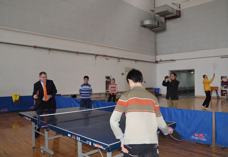 在蔡敬民、張文兵的陪同下,市長一行還參觀了校園,并對校園優美的環境、完善的教學設施表示贊嘆。在參觀體育館時,巴頓市長還接過拍子同我院正在打乒乓球的電子系許文山同學對決一局,并合影留念。巴頓市長的和藹可親給大家留下了深刻的印象。