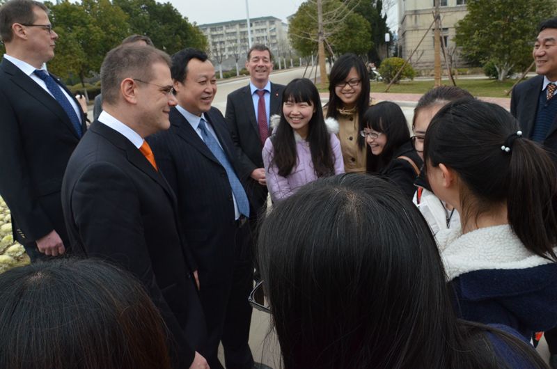 座談會上,蔡敬民首先對巴頓市長一行表示歡迎,并對我院的基本情況做了簡單介紹。他說,合肥學院是1985年中德共建的一所大學,目前學院已經發展成一所特色鮮明的應用型大學。合作期間,我院共派90多名教師赴德學習交流,并結合院校自身的實際特點不斷引進和創新“應用型”辦學理念,總結出適合學院發展的辦學途徑和方法。我院的成功經驗為中國高校應用型人才培養的改革產生了重大影響,過去的四年里,國內共有270多所院校來我院考察交流,借鑒應用型人才培養模式。蔡敬民希望今后的中德合作能夠得到巴頓市長的支持,并提議在施特拉松市建立孔子學院,進一步加強雙方交流。他還強調中國安徽——德國中心、德國物流協會合肥分會都坐落在合肥學院,為雙方的合作奠定了堅實的基礎,也希望借此進一步推動兩國、兩市的合作,開展更多實質性的工作。