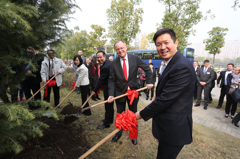 種植友誼樹(右二:斯特凡?魏爾州長) 為友誼樹揭牌 參觀“合肥學院對德合作交流展” 親切交流