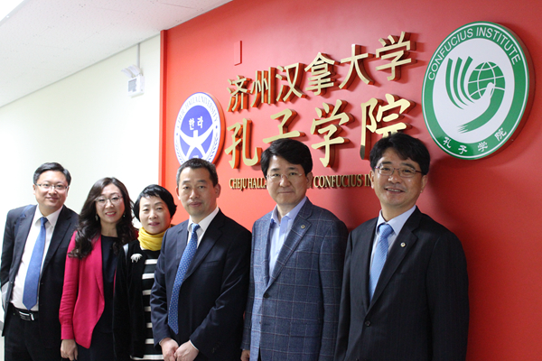 訪問濟州漢拿大學期間,張文兵與該校總長金星勛商定雙方在現(xiàn)有學生交流基礎上擴大規(guī)模,特別是在電子、機械、3D打印等產業(yè)領域開展交流;參觀了漢拿大學觀光經營系產學中心、孔子學院及漢拿大學幼兒園;看望了我校赴該校執(zhí)教老師及“1.5+1.5”專業(yè)學生,與他們就學習深造、個人創(chuàng)業(yè)等問題進行了深入交流。