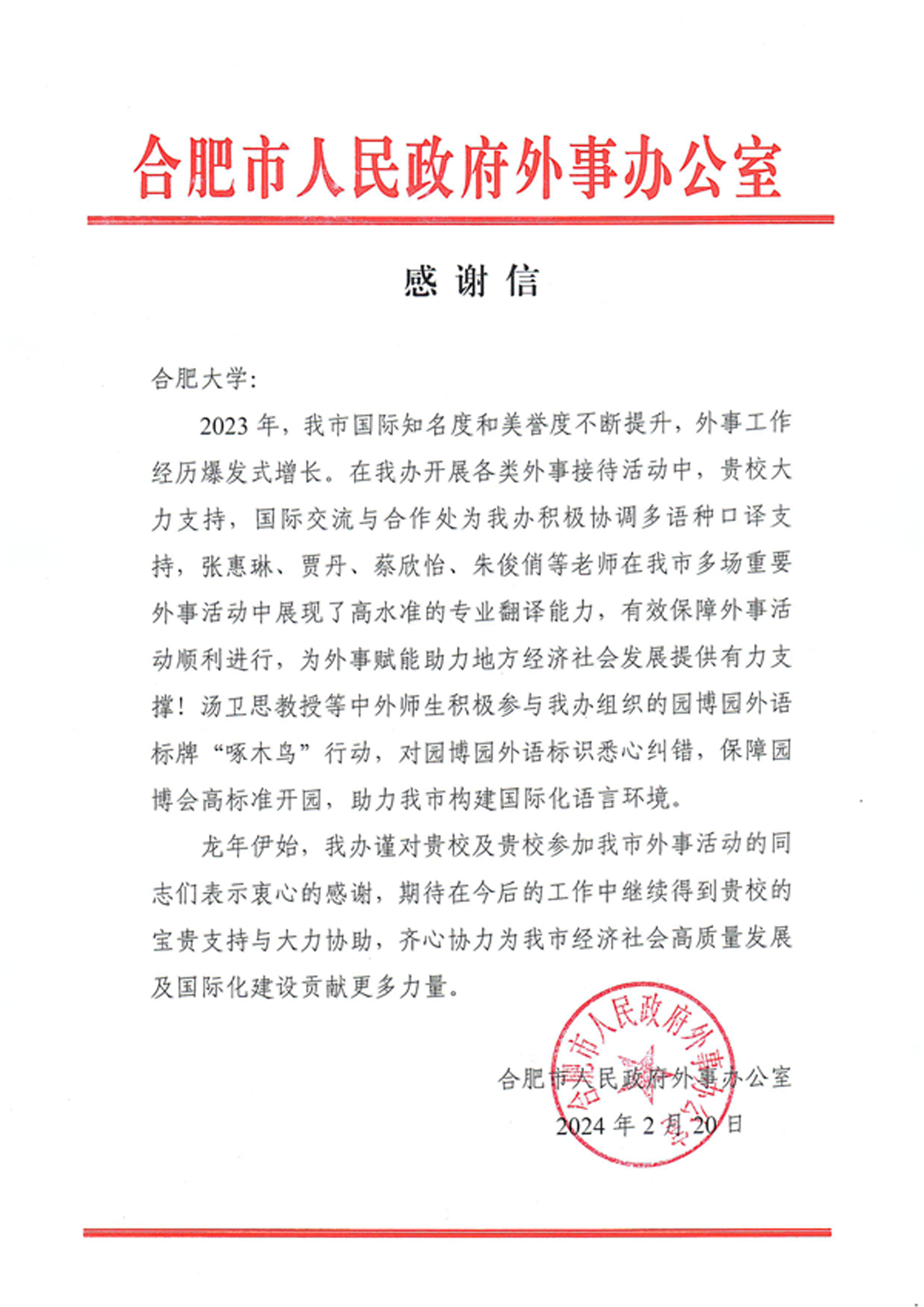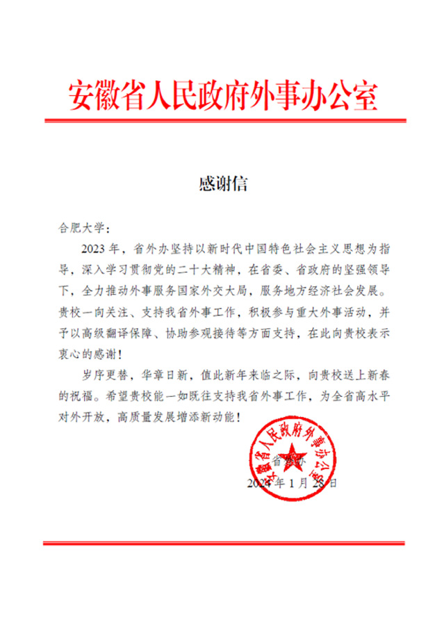 近日,安徽省人民政府外事辦公室、合肥市人民政府外事辦公室分別向合肥大學發來感謝信,充分肯定我校在2023年服務地方經濟社會發展、積極參與省市重大外事活動所做出的貢獻。