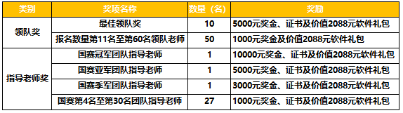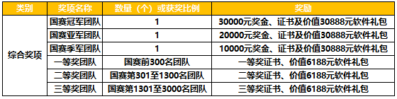 國賽冠軍團隊獲30000元獎金及證書;國賽亞軍團隊獲20000元獎金及證書;國賽季軍團隊獲10000元獎金及證書,國賽冠亞季軍團隊成員均可獲得價值30888元的軟件大禮包一份。