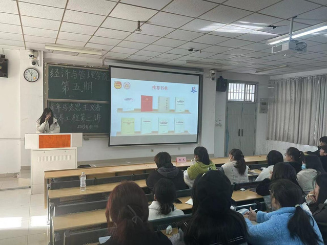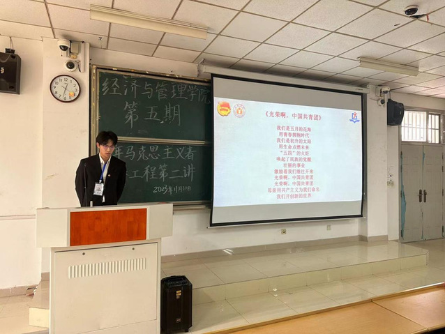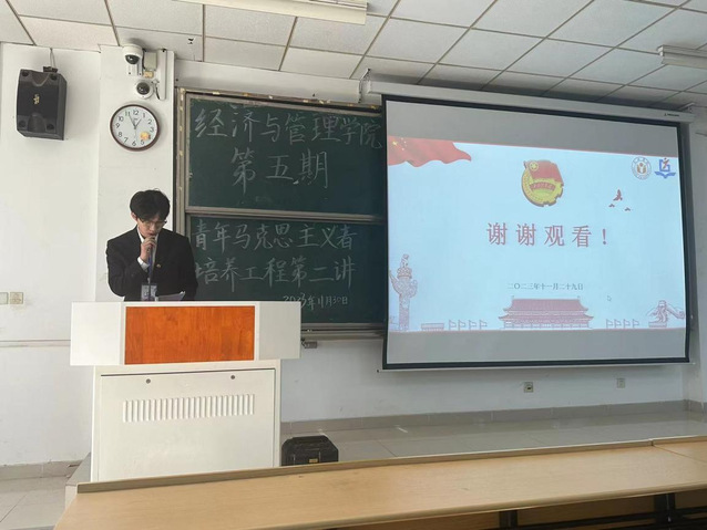 青風不止,博學篤行。為深入學習宣傳貫徹黨的二十大精神,加強對青年大學生的思想政治引領,著力為黨培養和輸送青年政治骨干,2023年11月30日經濟與管理學院第五期青年馬克思主義者培養工程第二講于一期校園五棟101室成功舉行。此次課程由經濟與管理學院團委兼職學生副書記黃戈同學主講,第五屆團委學生會成員與23級新生班干參與學習。
