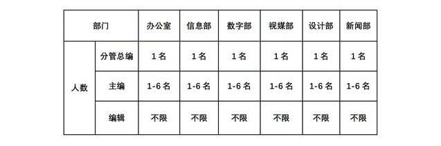 南艷青年新媒體中心設(shè)理事會(huì),理事會(huì)下設(shè)辦公室、信息部、數(shù)字部、新聞部、視媒部、設(shè)計(jì)部六個(gè)部門(mén)。理事會(huì)設(shè)總編、副總編,各部門(mén)設(shè)分管總編、主編、編輯、實(shí)習(xí)小編。