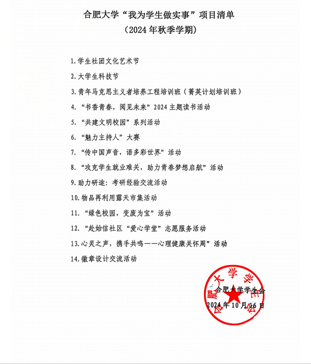 合肥大學“我為學生做實事”項目清單
